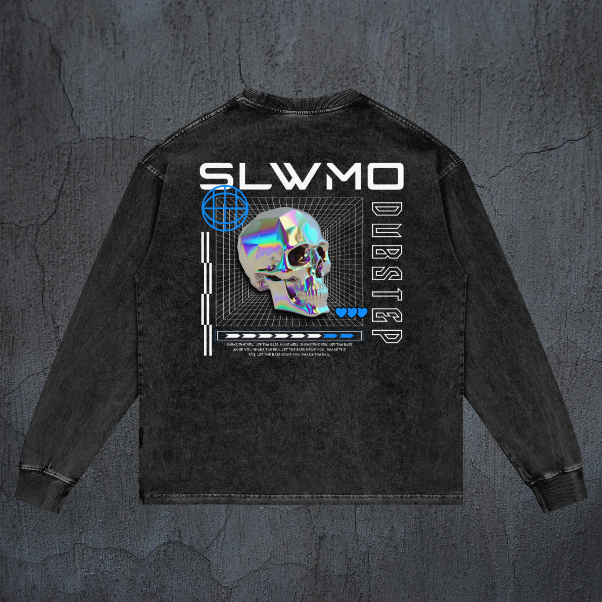 SLWMO 'Skull Future' design printed on a black acid-washed, premium, & heavyweight long sleeve shirt.