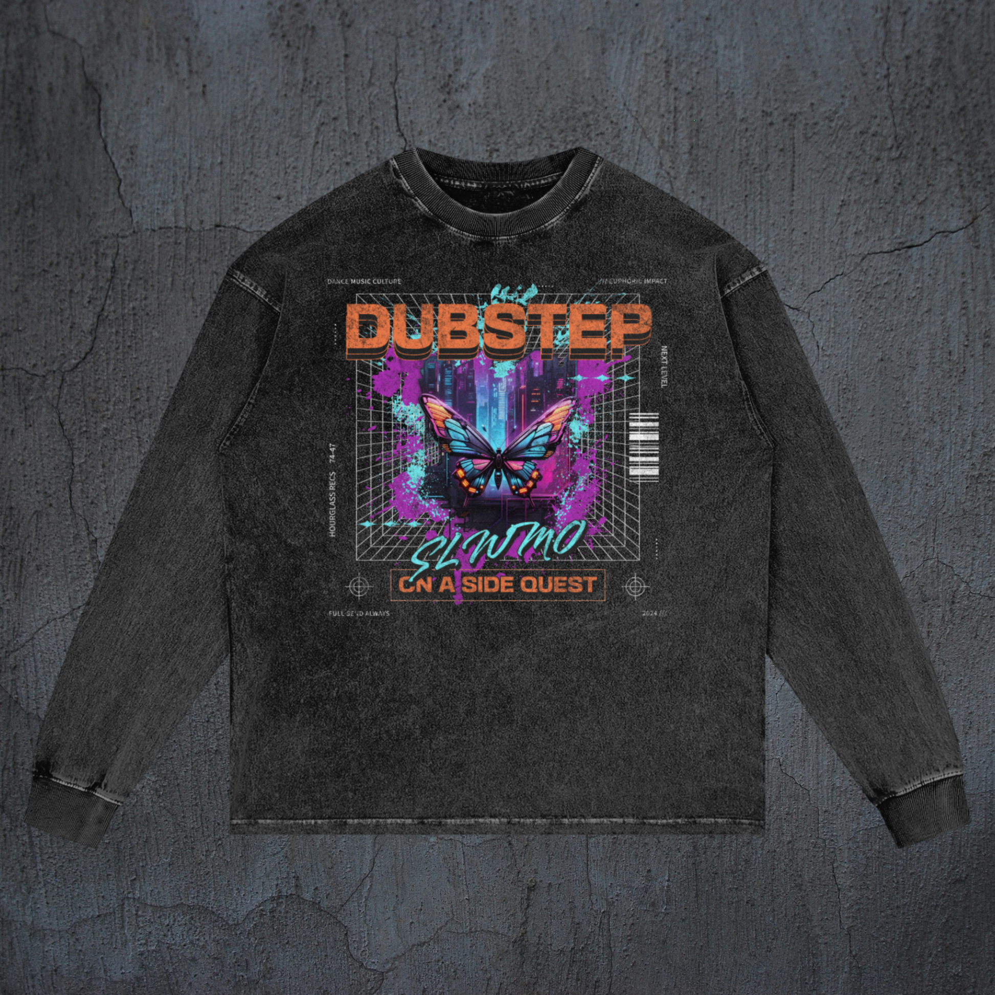 SLWMO 'Side Quest' design printed on a black acid-washed, premium, & heavyweight long sleeve shirt.
