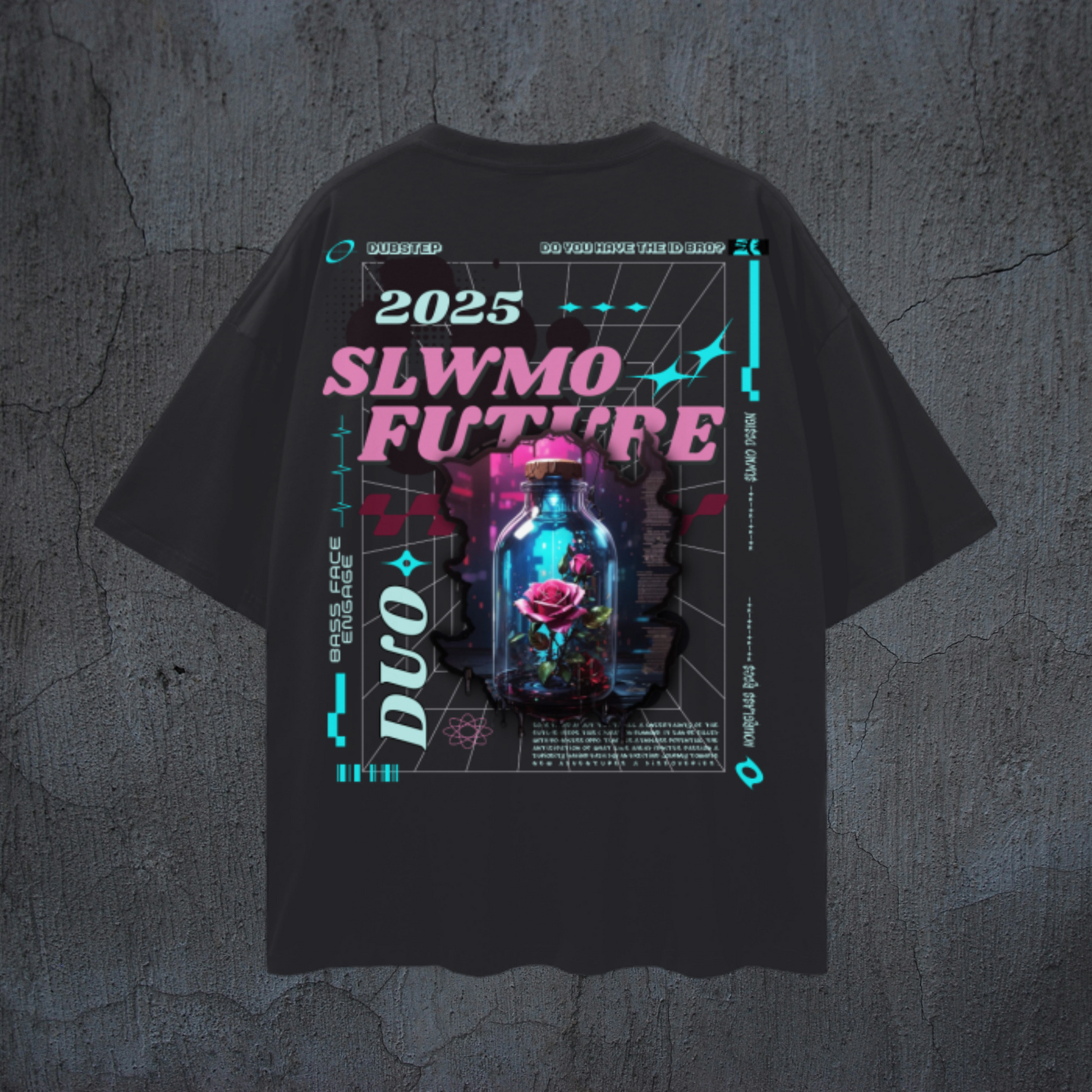SLWMO 'Bottled Rose' design printed on the back & a blue SLWMO logo with pink glow printed on the front of an extra soft, heavyweight, black t-shirt.