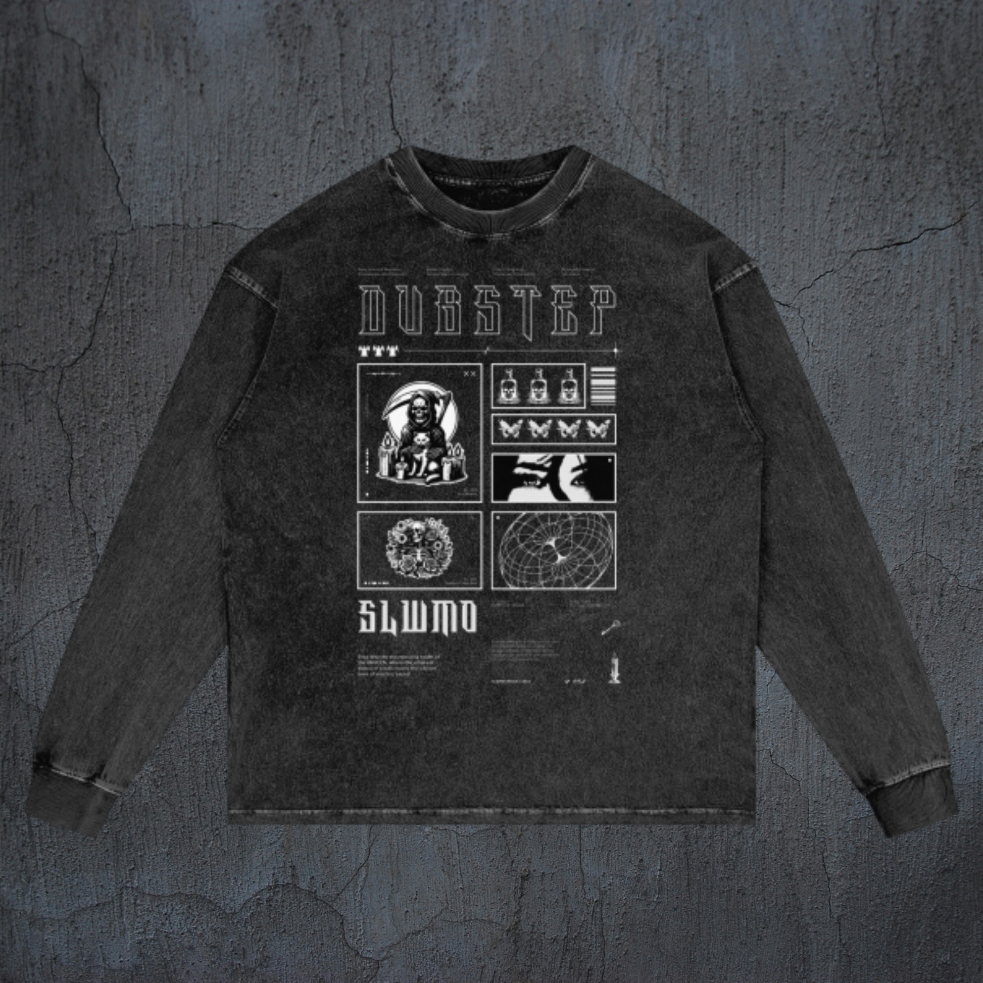 SLWMO 'Frames' design printed on a black acid-washed, premium, & heavyweight long sleeve shirt.