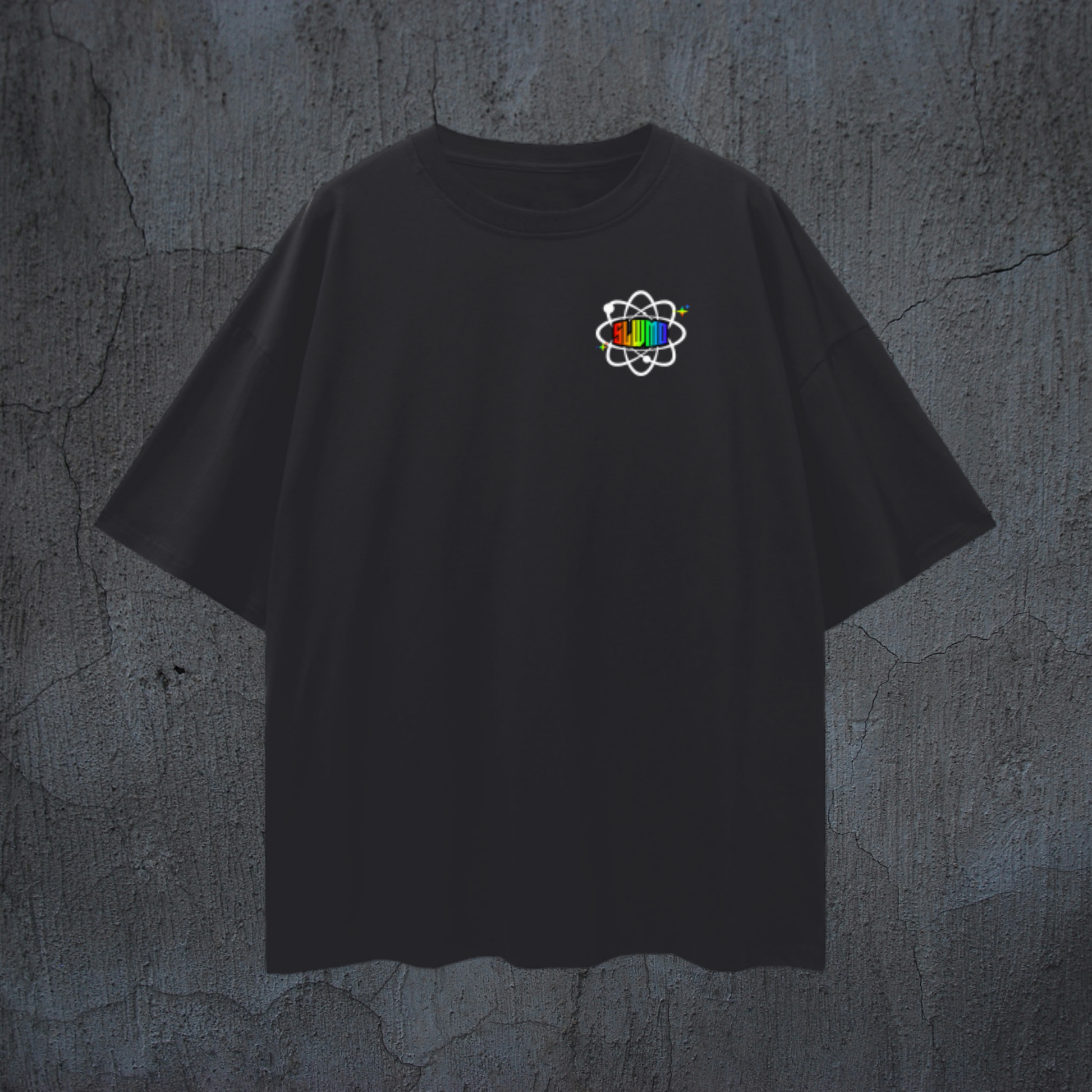 Small SLWMO atom-inspired gradient logo printed on the left chest with “In Dubstep We Trust” design printed on the back of a black, extra soft, heavyweight t-shirt. Also featuring a sappy love note for you all. <3