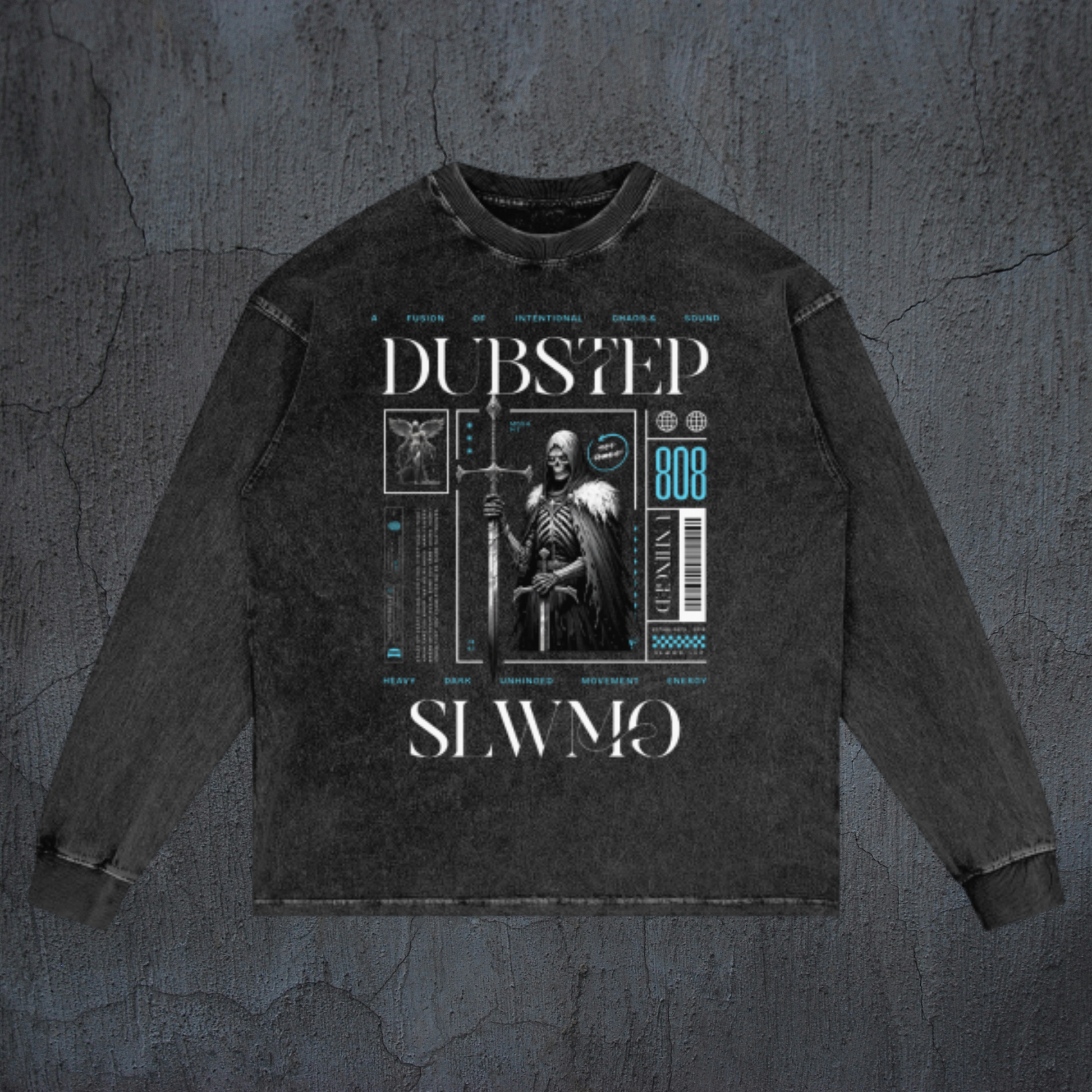 SLWMO 'Mosh Pit' design printed on a black acid-washed, premium, & heavyweight long sleeve shirt.