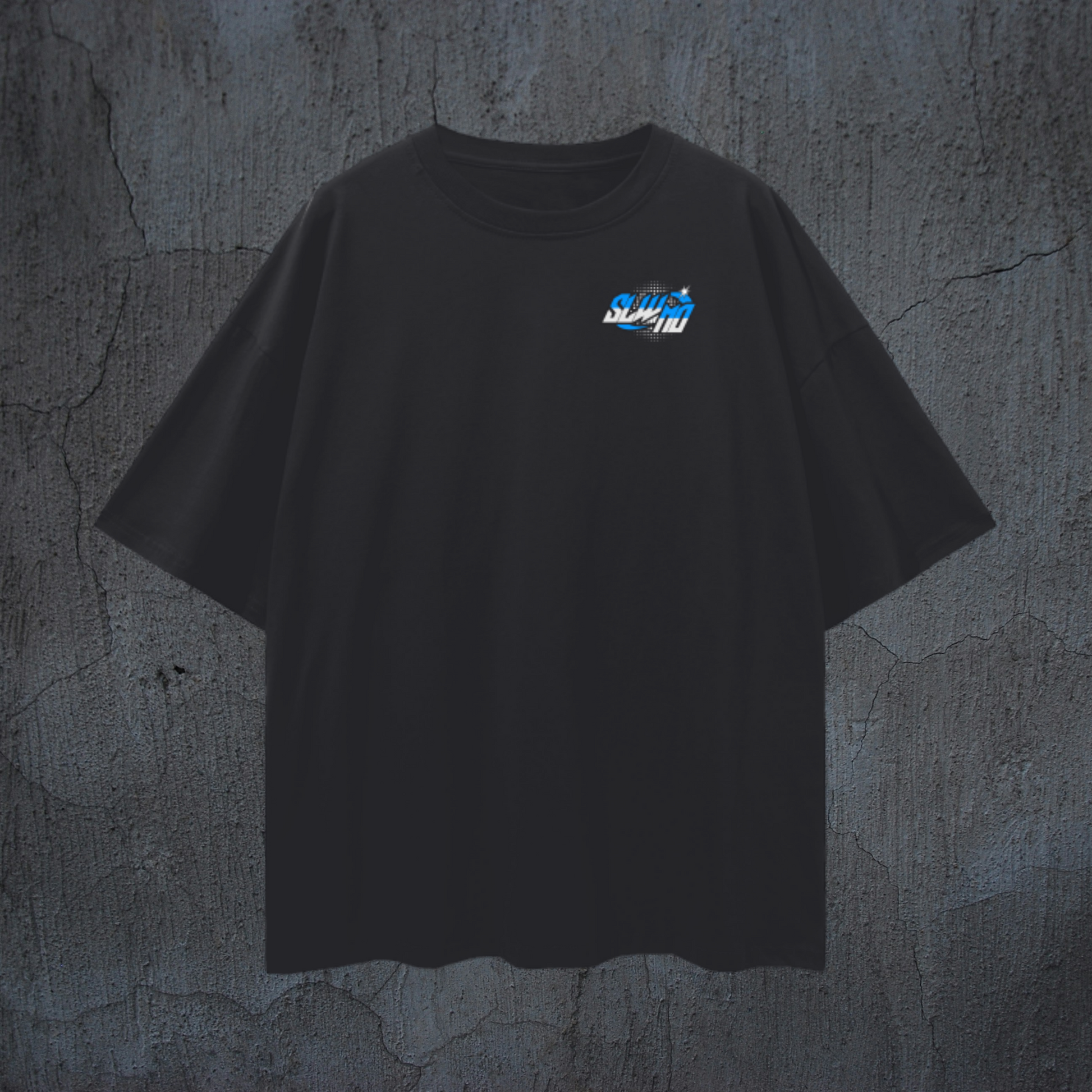 Small SLWMO futuristic logo printed on the front chest & a dubstep skull futuristic/Y2K design printed on the back of a black, extra soft, heavyweight t-shirt.